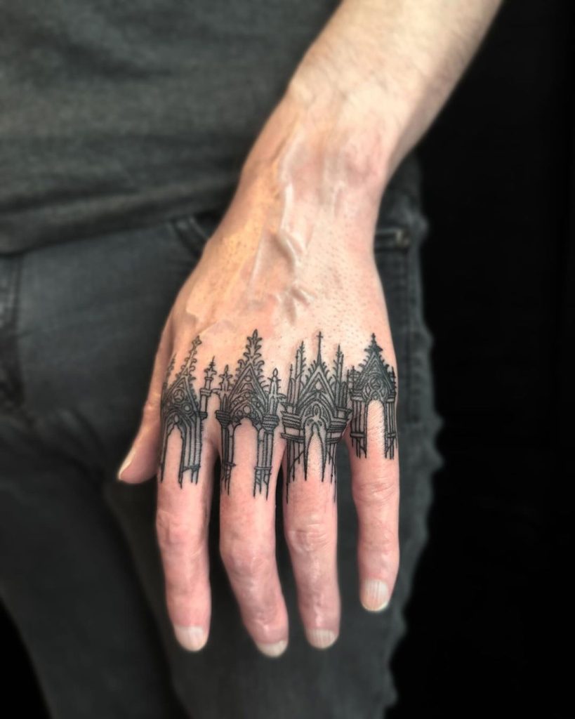 This tattoo on the hand resembles the pointed arches and intricate spires of gothic cathedral architecture. The delicate linework and fine details give each finger a towering, cathedral-like appearance, creating the impression of a miniature cityscape. This design adds a bold, architectural elegance to the hand, blending classic gothic beauty with a unique, modern placement.