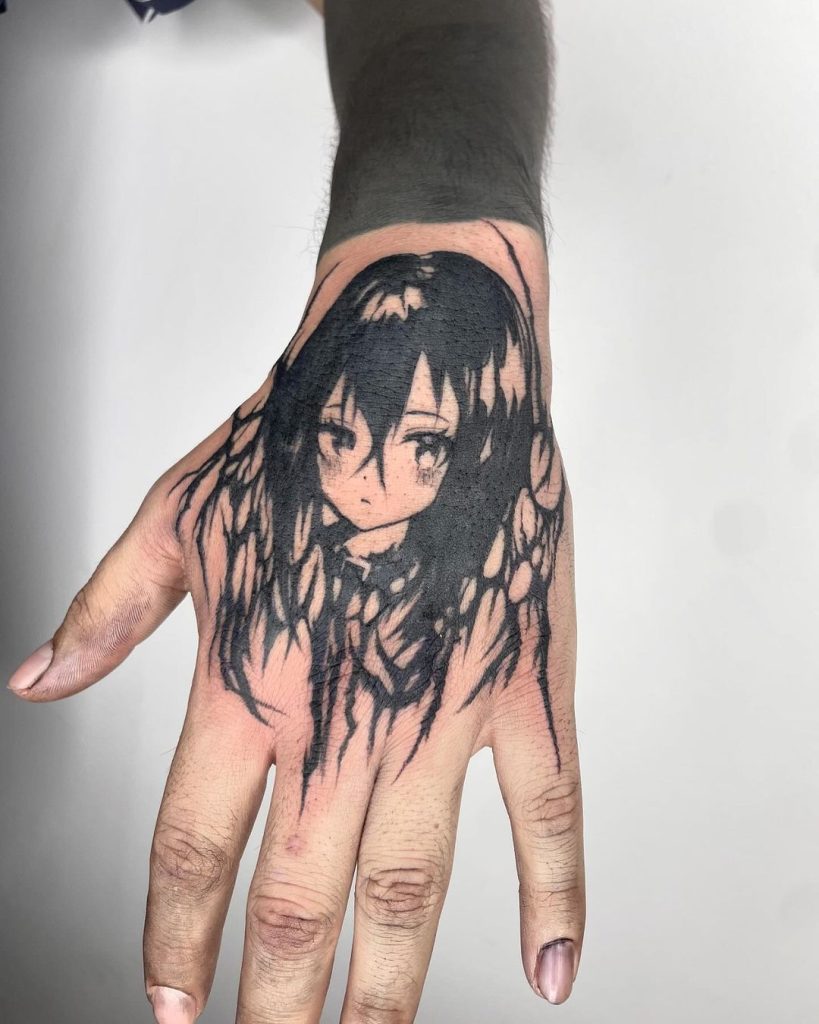 This hand tattoo features an expressive anime-style face with flowing hair, shaded in bold black ink that covers the top of the hand. The design’s intense dark contrast and wispy edges give the character a mysterious, shadowy appearance, making it a striking tribute to anime art.