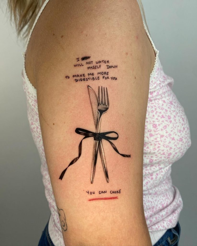 This tattoo features a realistic knife and fork tied together with a black ribbon, creating a symbolic image. Above, text reads, “I will not water myself down to make me more digestible for you,” with “You can choke” emphasized in red below. Located on the upper arm, this design makes a strong, unapologetic statement about self-worth and authenticity.