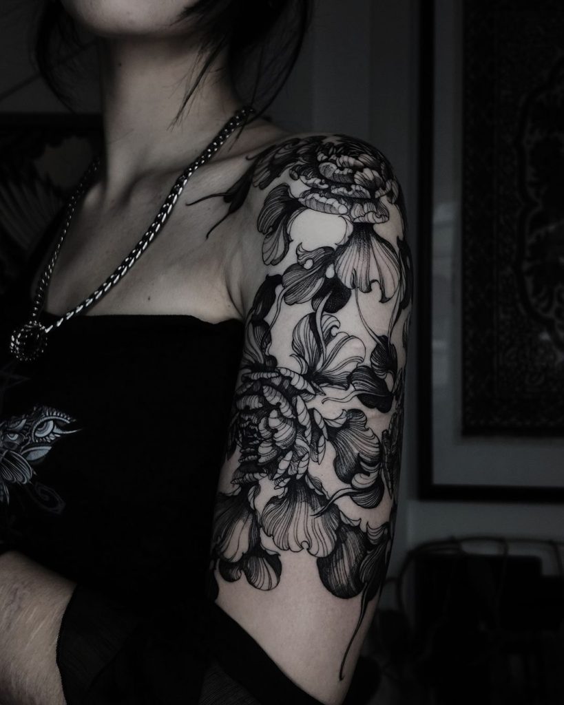 This beautiful tattoo on the upper arm features intricate peony flowers in full bloom, their petals layered and delicate. The dark, detailed lines bring out the depth of the petals, giving the design a graceful and timeless look. Wrapping around the arm, these peonies create a flowing floral pattern that is both bold and elegant.