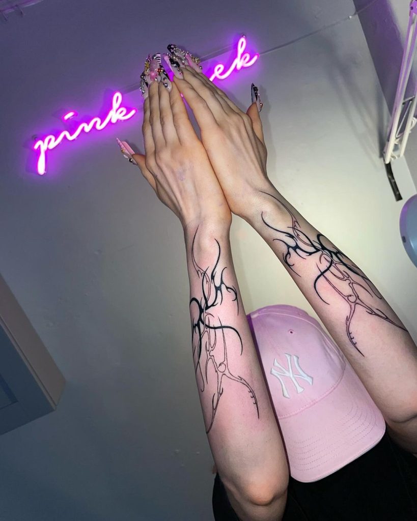This cybersigilism tattoo features twisting, abstract tendrils that gracefully flow up each forearm. The dark, fluid lines create a striking and organic look, adding an edgy yet elegant vibe to the arms. This mirrored design brings a sense of movement and unity, perfectly suited for a bold and unique style.
