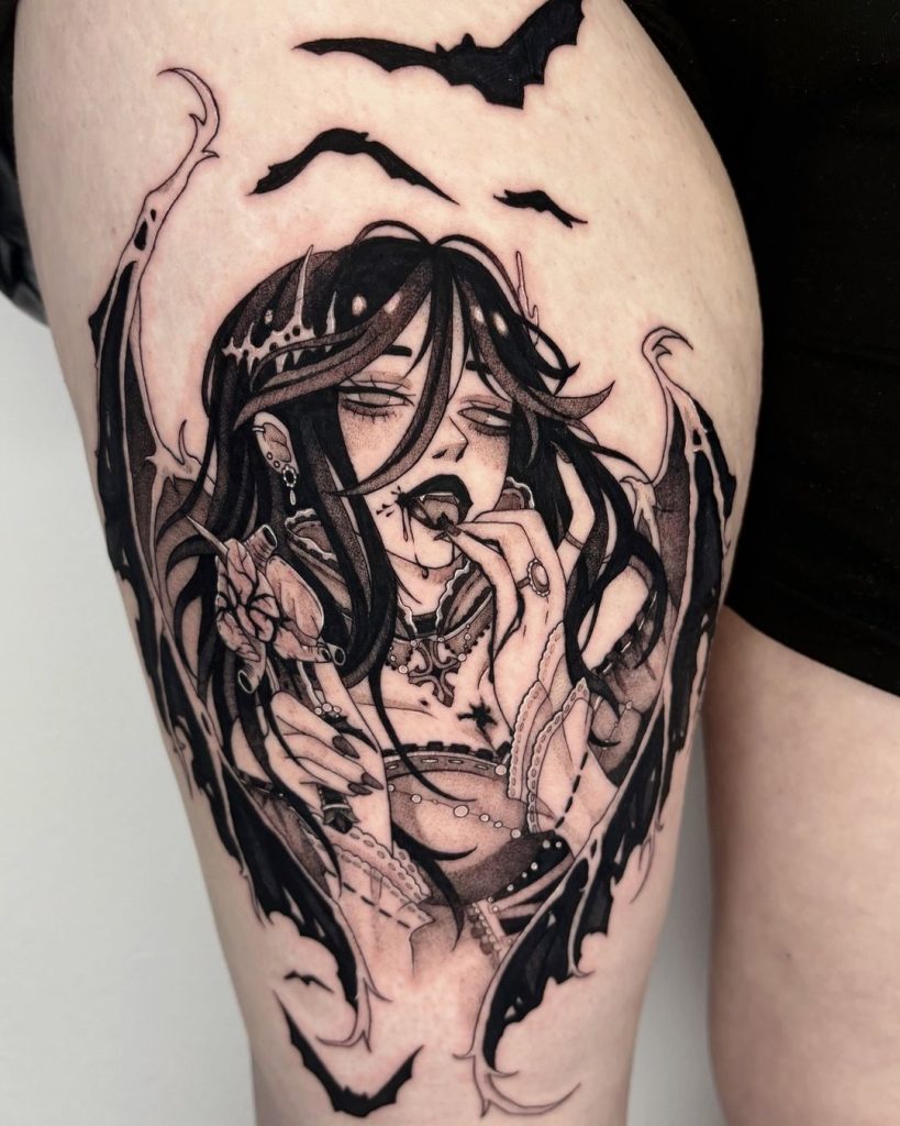 This tattoo shows a gothic-style woman with flowing black hair, closed eyes, and a haunting expression as she bites her finger. Intricate details in her jewelry and clothing, along with dark bats flying above, add to her mysterious vibe. Located on the thigh, this design captures the essence of dark femininity with a blend of elegance and eerie beauty.