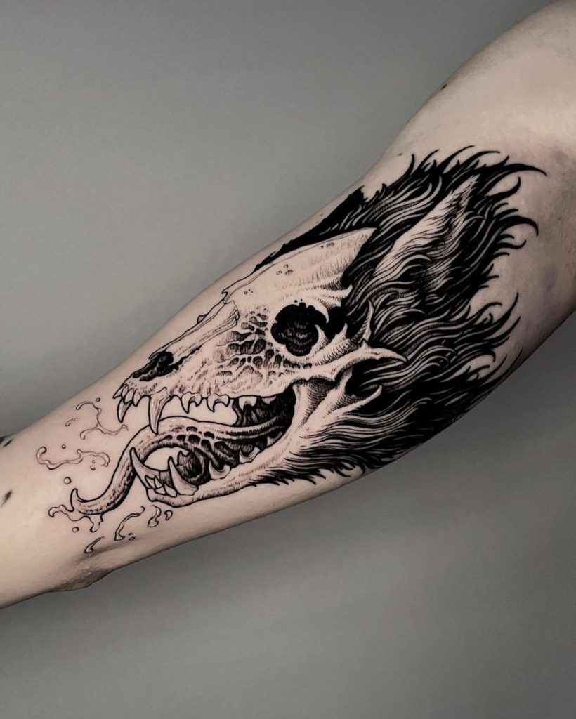 This striking tattoo shows a detailed wolf skull, complete with sharp teeth and a long, curling tongue, giving it a fierce and wild look. The skull is framed by intense black fur-like shading that adds depth and movement to the piece. Located on the inner forearm, this design captures the powerful spirit of the wolf in a bold, edgy way.