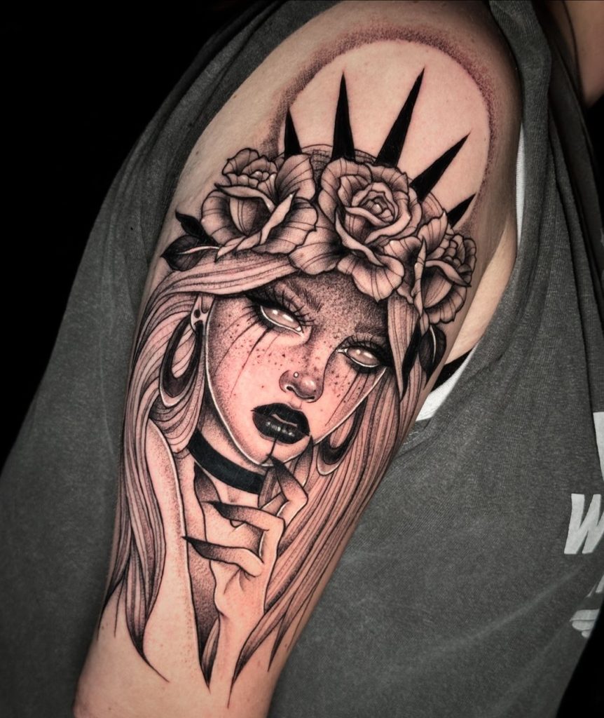 This striking tattoo features a gothic-inspired woman with hollow, glowing eyes, dark lipstick, and a choker, giving her an intense, mysterious look. She wears a crown of detailed roses and sharp black spikes that resemble a dark halo, adding an almost divine aura. Positioned on the upper arm, this design blends beauty with a haunting edge, creating a powerful, otherworldly figure with both elegance and attitude.