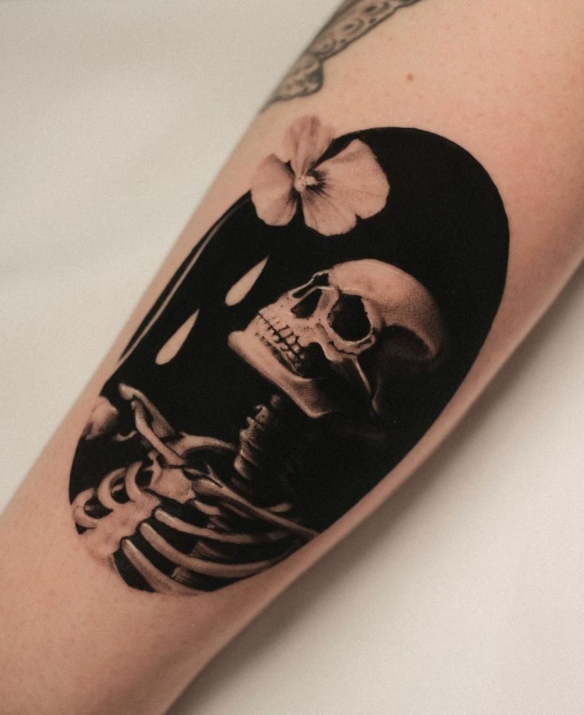 This tattoo features a detailed skeleton against a solid black background, gazing up at a single, delicate flower above. The contrast between the dark shading and the soft flower creates a striking visual of life and death. Located on the arm, this design captures a thoughtful, almost serene vibe, blending elements of mortality with gentle beauty.