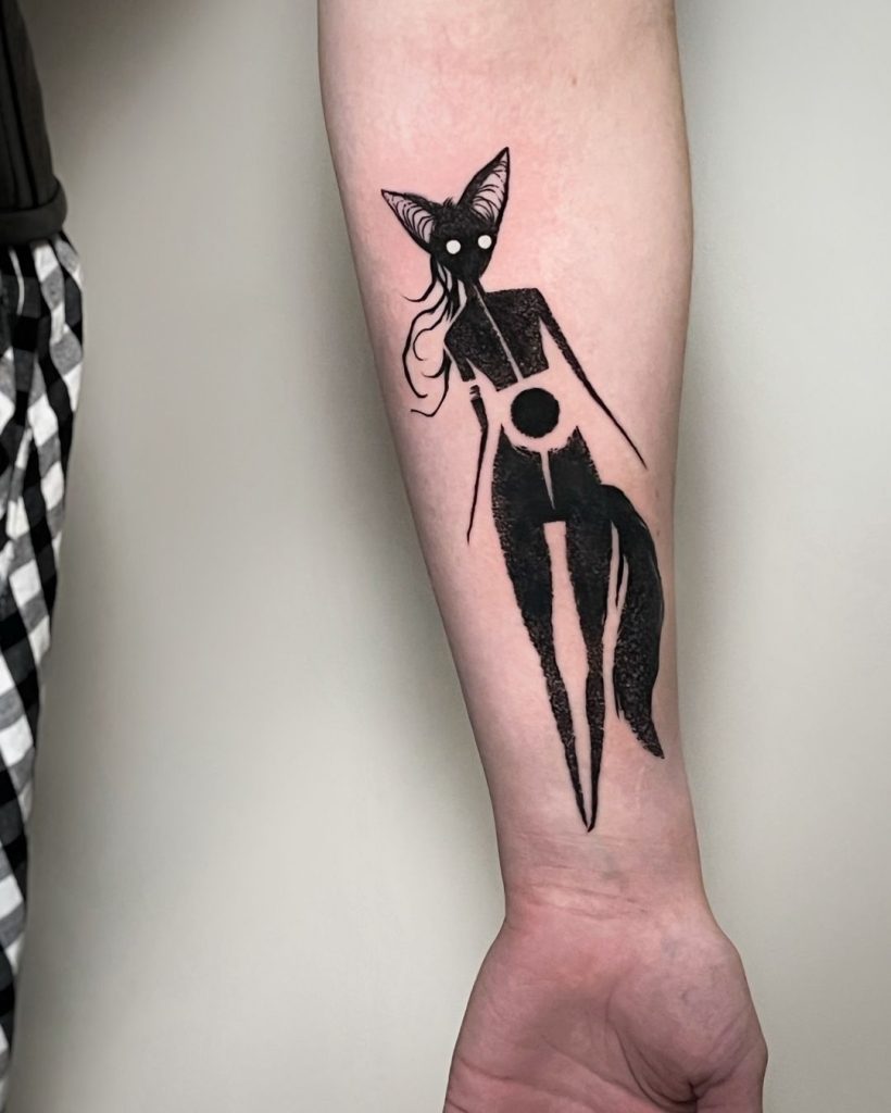 This tattoo showcases an abstract, shadowy figure with long limbs and a slender body, featuring fox-like ears and glowing white eyes. The dark, minimalist design creates an eerie, mystical feel, as if the creature is emerging from shadows. Positioned on the forearm, this tattoo adds a sense of mystery and imagination, evoking a surreal, otherworldly vibe.