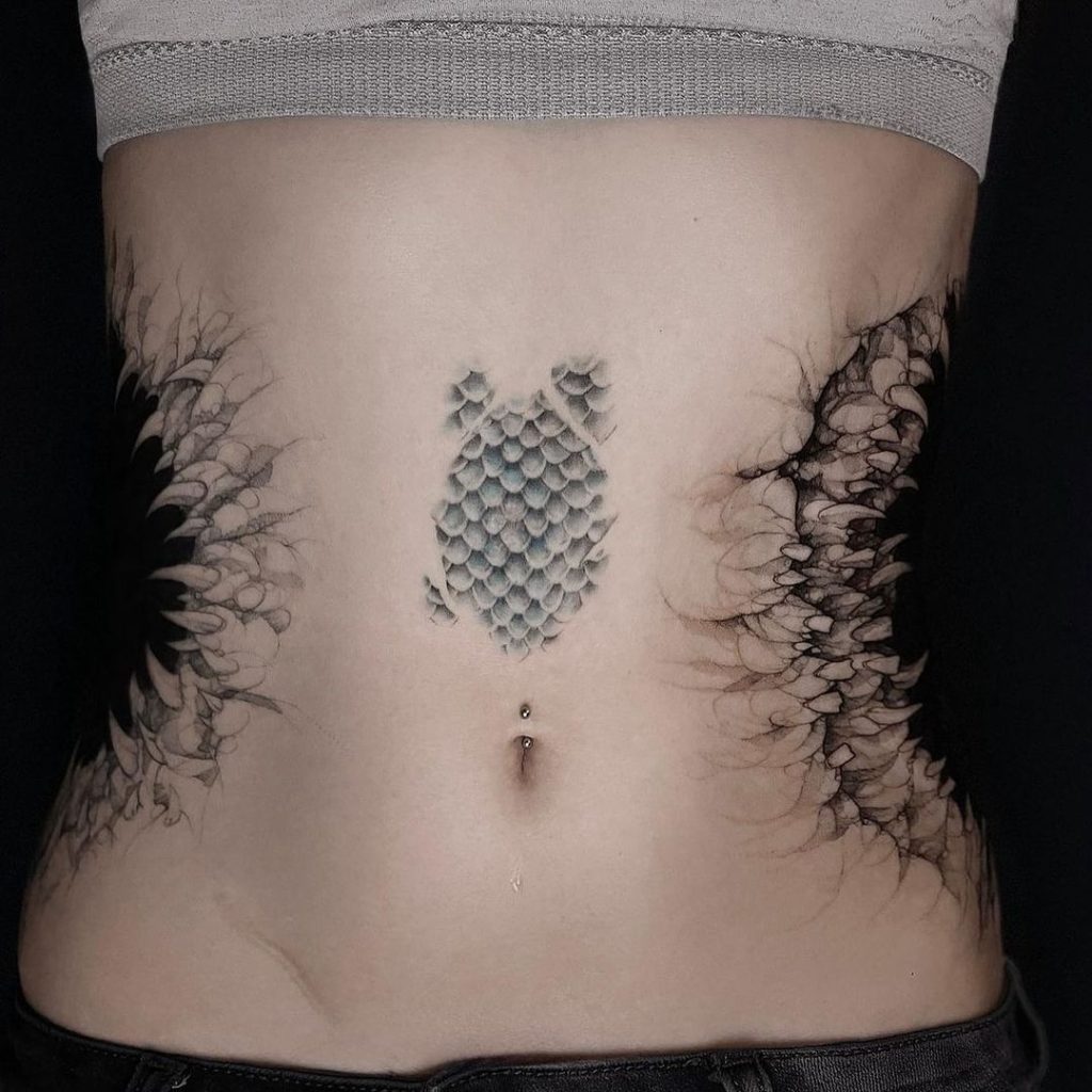 This unique tattoo features a patch of textured dragon scales in the center of the stomach, giving a mystical look with soft shading in blue-gray tones. On each side, abstract smoke-like designs stretch outward, creating a contrast with their dark, wispy edges that seem to be spreading from the scales. Positioned across the stomach, this tattoo gives a powerful, otherworldly vibe, like a dragon s essence is emerging from within.