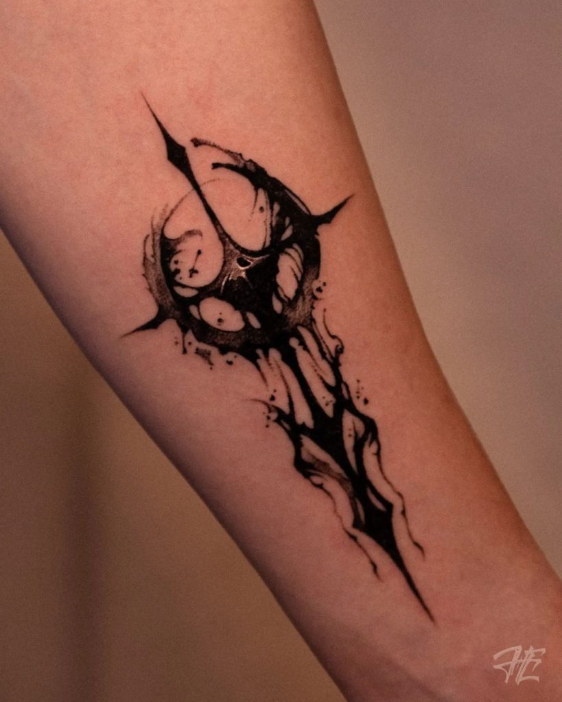 This tattoo features a black, spiked orb with a textured, ink-splatter effect, giving it a bold, otherworldly appearance. Jagged lines extend downward, adding movement and intensity to the design. Located on the forearm, this piece creates a striking visual with its sharp edges and dark, cosmic energy.