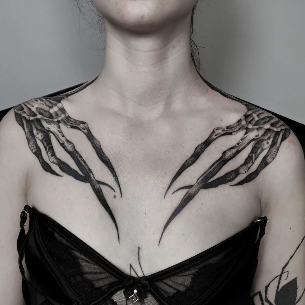 This bold tattoo design features skeletal claw-like hands that stretch across each collarbone, creating an eerie, gripping effect. The dark shading and bone structure details give the claws a realistic, three-dimensional appearance, as if they’re reaching down from the shoulders. Positioned on the chest and collarbones, this tattoo adds a striking, gothic touch, merging body art with a sense of dark, supernatural allure.