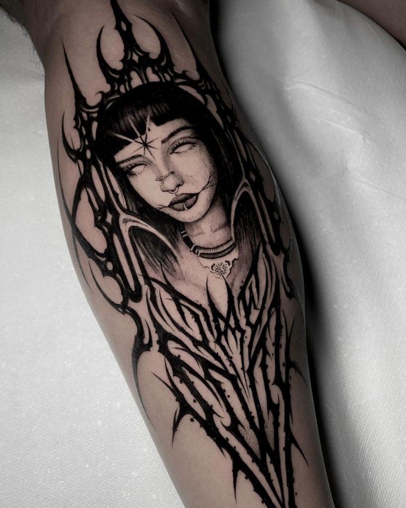 This tattoo depicts a serene, mystical woman with her eyes closed, framed by intricate, thorn-like shapes that create a dark, enchanted atmosphere. Her forehead features a radiant star symbol, adding to the magical vibe, while delicate shading on her face brings a lifelike quality. Located on the calf, this design blends portraiture with bold, abstract elements, making it both captivating and unique.