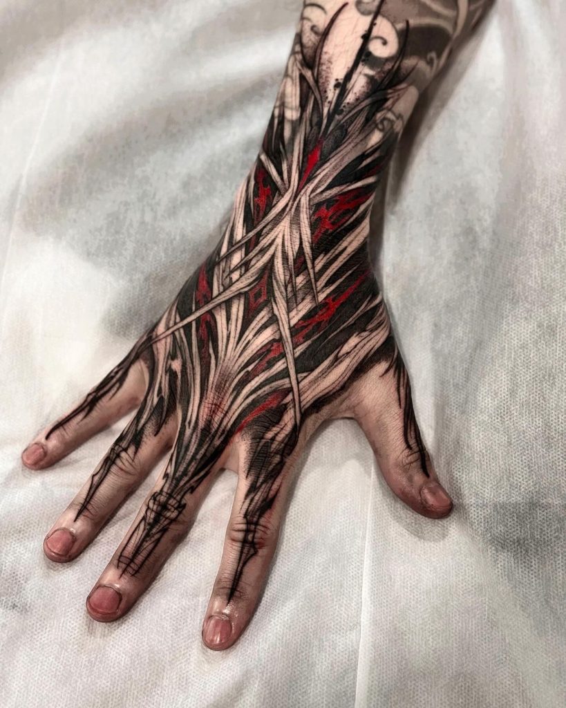 This tattoo covers the hand with intricate, vein-like lines and shading, creating a textured, organic pattern that flows over the fingers and wrist. Thin red accents peek through the black and grey lines, adding depth and intensity to the design. The overall effect is raw and dynamic, giving the hand a powerful, almost elemental look.