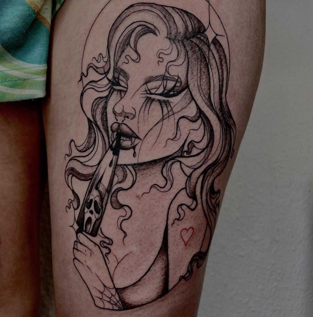 11. Haunted Femme with Dagger Tattoo on Thigh