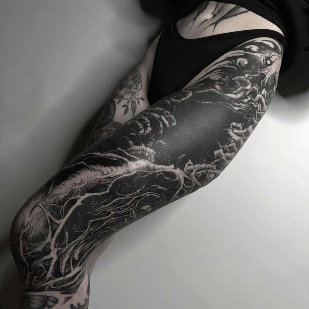 This intense leg tattoo uses deep black ink to create a dark, moody forest scene, with trees and roots etched out through intricate negative space detailing. The design wraps around the thigh and leg, giving the appearance of a shadowy, enchanted forest creeping up the skin. This bold, immersive piece blends mystery and nature, making the leg look like it’s part of an otherworldly landscape.