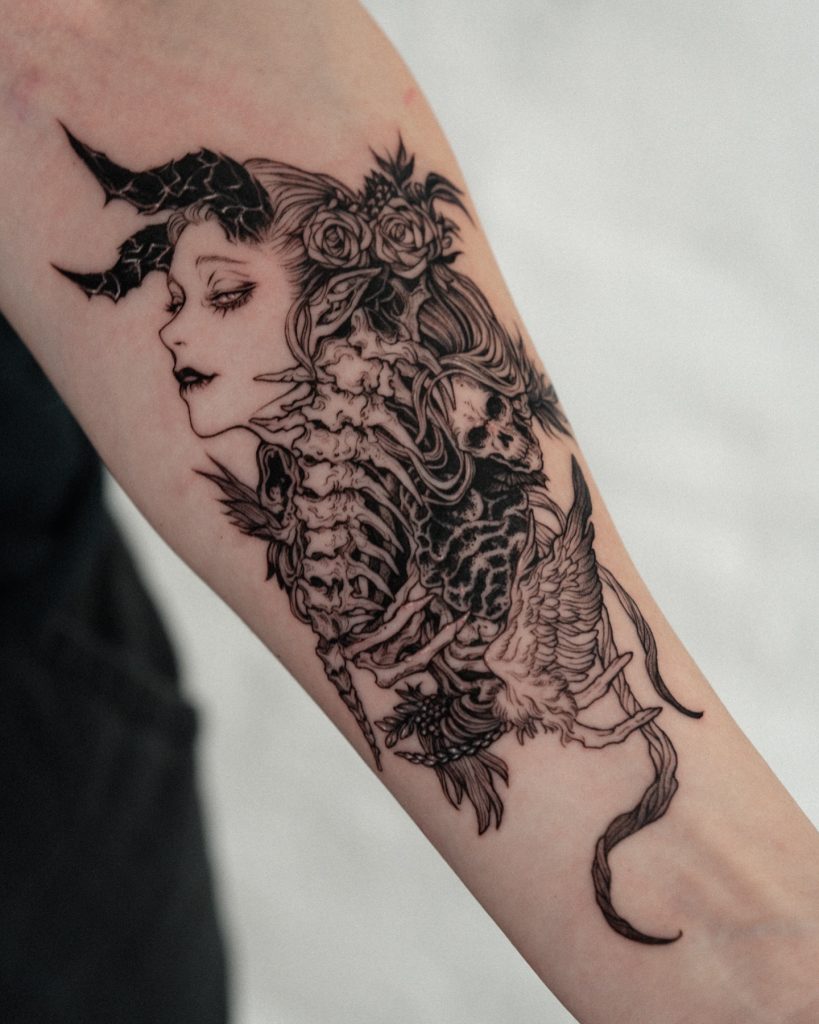 This tattoo features an ethereal woman with horns and flowers in her hair, seamlessly blending into skeletal elements and feathered wings. The intricate details, from her serene expression to the delicately drawn bones and feathers, give the piece a haunting beauty. Located on the forearm, this design captures a blend of dark fantasy and elegance, evoking the image of a mythical, otherworldly creature.