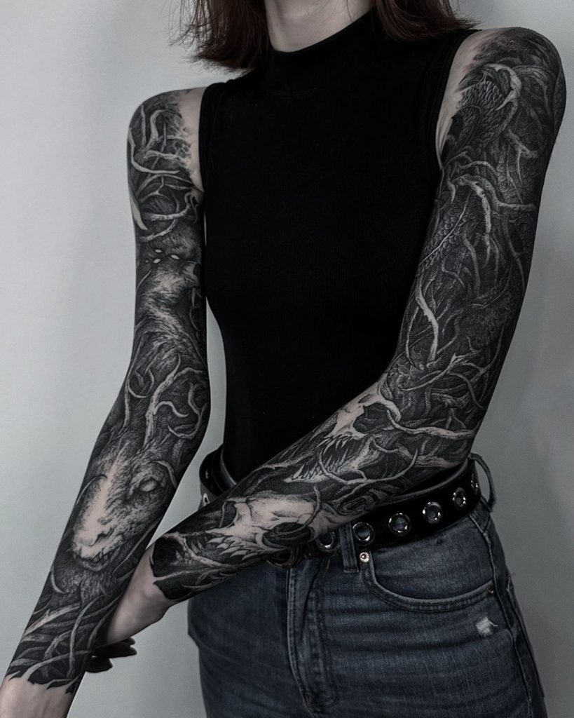 This intense full-sleeve tattoo captures the haunting beauty of a dark forest, with twisted tree branches, eerie shadows, and the detailed face of a deer with piercing eyes. The design extends from shoulder to wrist, creating a seamless flow of nature-inspired imagery that wraps around both arms. It has a mystical and earthy feel, perfect for someone with a love for the wild and mysterious.