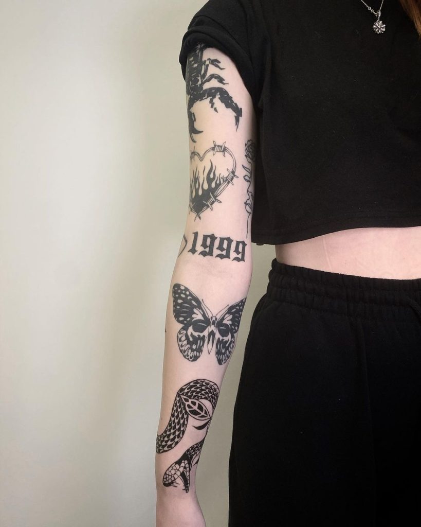 This black ink tattoo sleeve includes a bold mix of designs: a coiled snake with intricate scales, a butterfly with skull-like patterns in its wings, and a flaming heart wrapped in barbed wire. The number “1999” adds a personal touch, while dark shapes near the shoulder complete the gothic look. Located along the arm, this sleeve combines nature, symbolism, and a hint of mystery.
