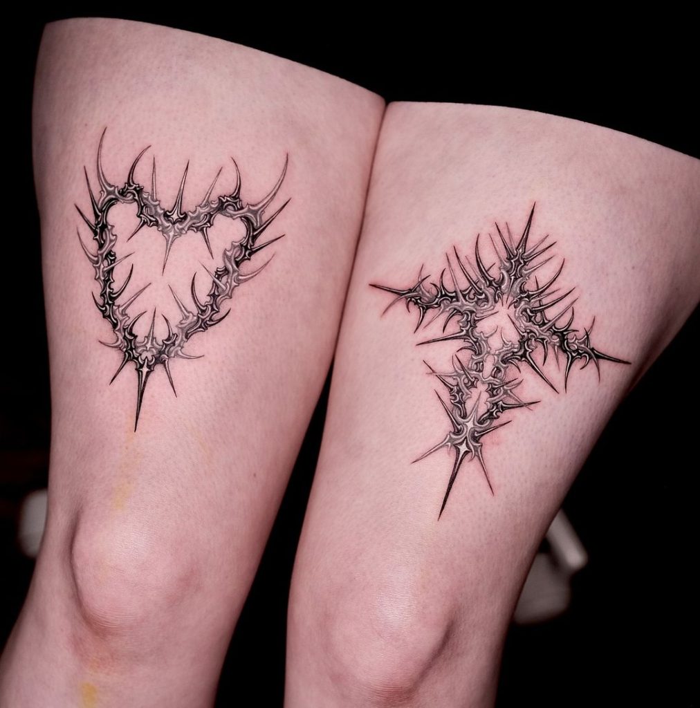 These two thigh tattoos feature a heart and a cross formed entirely from sharp, thorn-like designs. The spikes jut out dramatically, giving each symbol a fierce, protective vibe. With fine linework and bold detailing, these tattoos create a cool contrast between the softness of a heart and the strength of a cross.