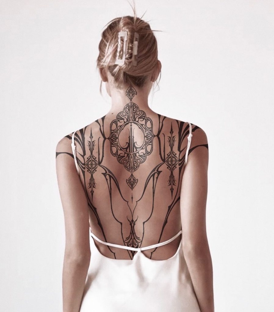 This intricate back tattoo features a symmetrical ornamental design with delicate lines and shapes that evoke a regal, almost mirror-like pattern down the spine. The tattoo extends from the nape to the lower back, with elegant curves framing the shoulders and wrapping around the upper arms. With its refined, decorative style, this piece beautifully complements the contours of the back, giving it a sophisticated, timeless look.