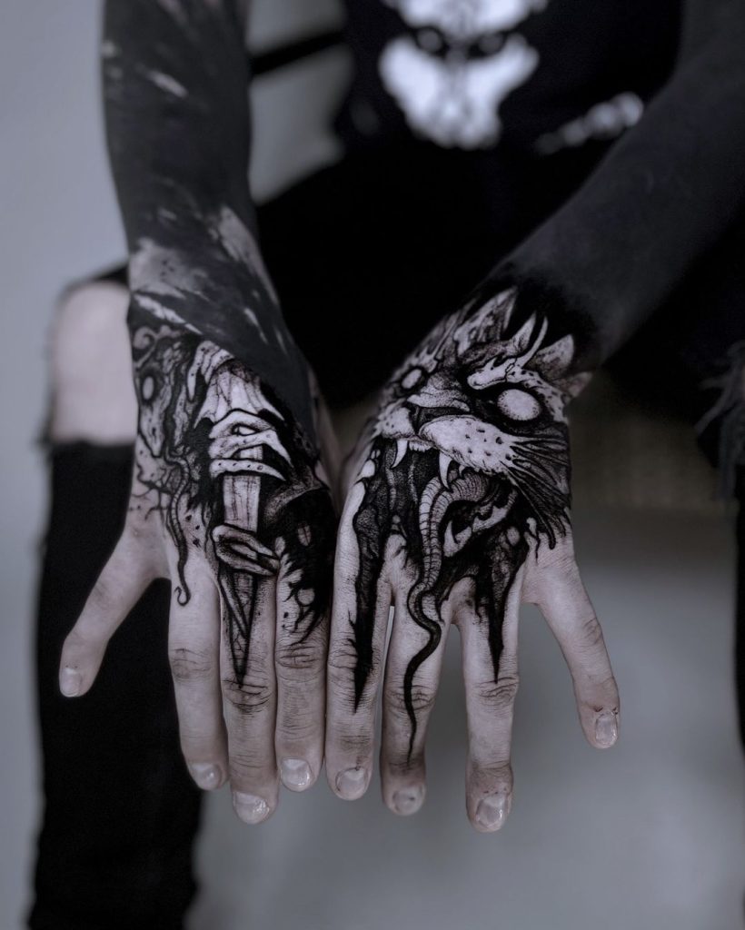 This intense tattoo design covers both hands, with one hand featuring a detailed dagger and the other a snarling, demonic cat. The high-contrast black ink gives the designs a bold, shadowy appearance, while the twisted details and fierce expressions add a haunting quality. Together, these tattoos create a powerful, gothic look that adds a sense of mystery and danger to each hand.