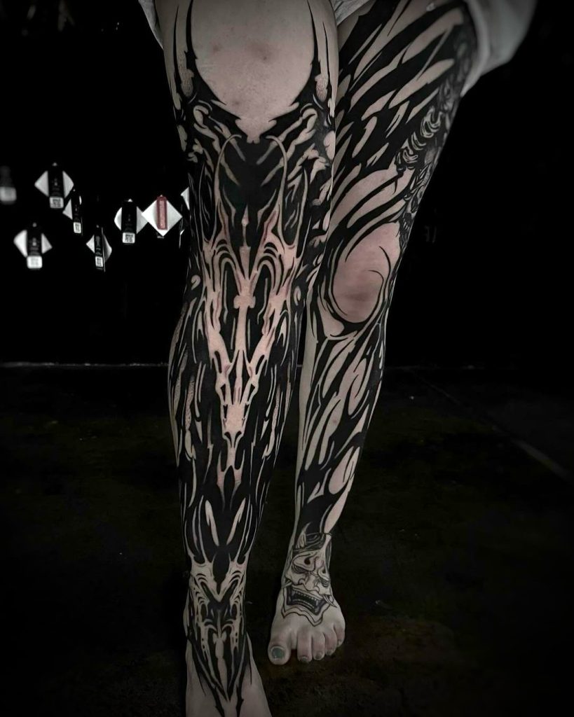 This striking leg tattoo features intricate, biomechanical patterns in bold black ink, creating a mirrored, armor-like effect down the entire leg. The intense contrasts and flowing shapes give a sense of movement and depth, resembling an abstract, skeletal structure. Covering both legs, this design has a dark, futuristic look, transforming the legs into a work of gothic, mechanical art.