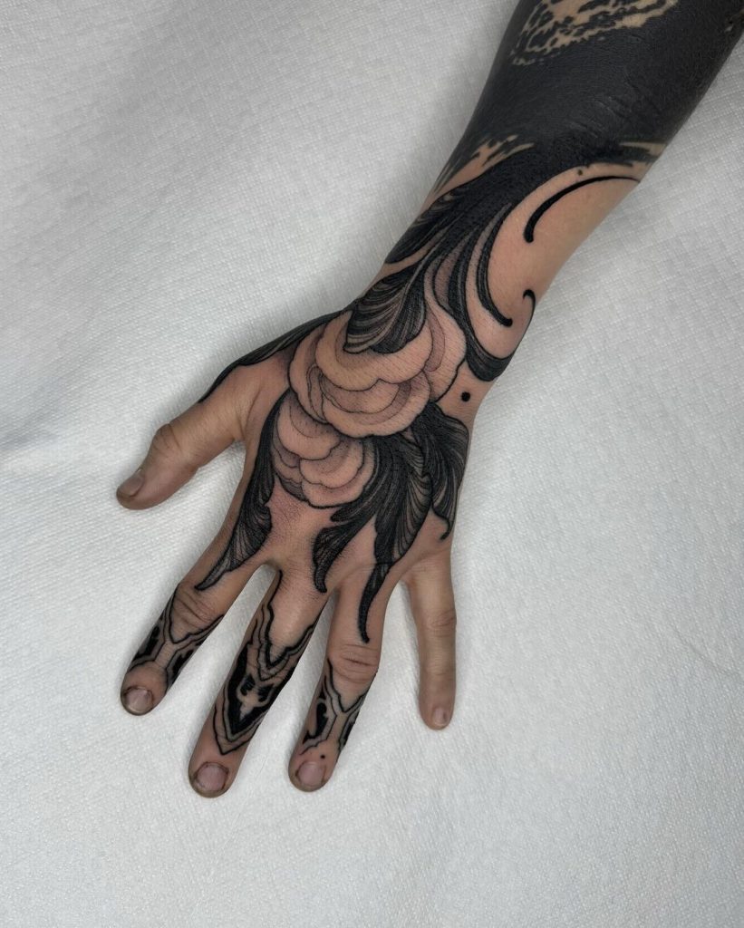 This intricate tattoo flows across the hand, with bold black petals and swirling leaves, creating a beautiful, flower-inspired design. The details continue onto the fingers, adding a unique, decorative touch that feels both elegant and edgy. It s a stunning piece that enhances the hand with a floral and ornamental style.