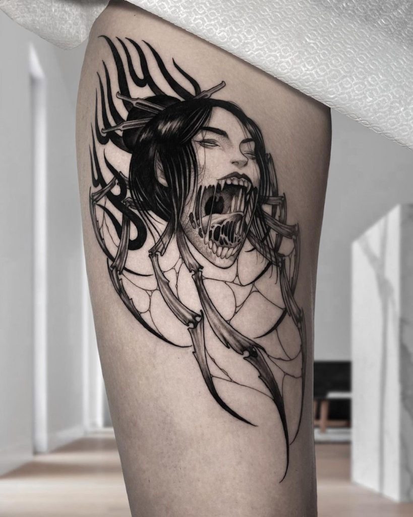 This intense tattoo depicts a woman with her mouth wide open in a terrifying scream, with sharp teeth and hollowed eyes, giving her a haunting, otherworldly look. Her dark hair flows wildly, with skeletal and claw-like shapes surrounding her head, adding to the eerie vibe. Located on the thigh, this tattoo captures a chilling blend of horror and beauty.