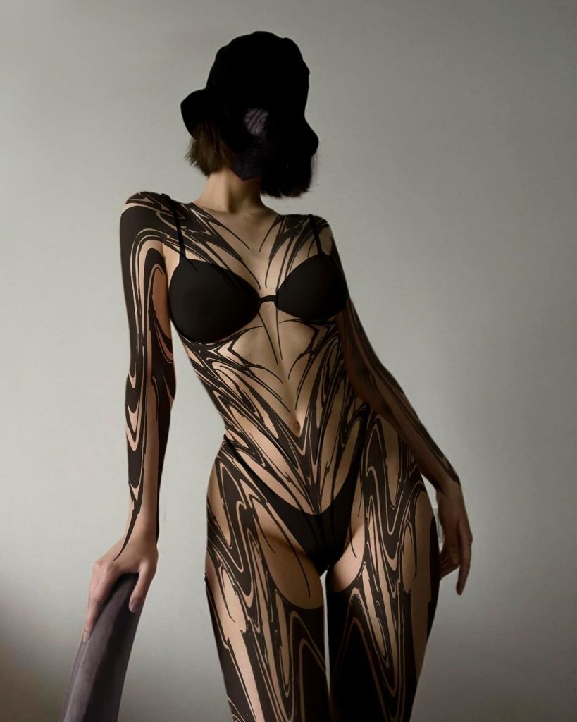 This unique full-body tattoo features swirling, abstract lines that wrap around the arms, torso, and legs, creating a striking, almost liquid effect. The black ink patterns emphasize the body s curves, giving a bold, sculpted look that feels like a second skin. Covering nearly the entire body, this design combines elegance with a dramatic, artistic vibe.