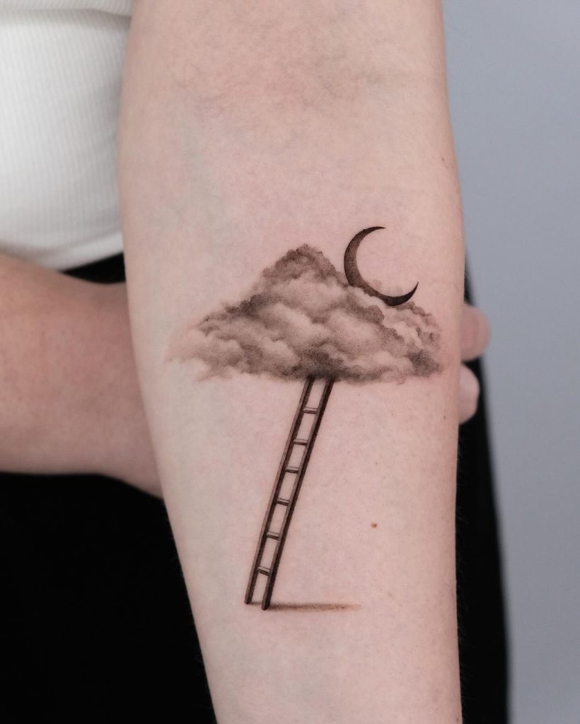 This dreamy tattoo shows a soft, fluffy cloud with a ladder leading up to it, and a crescent moon resting on top. Placed on the forearm, it creates a feeling of reaching for the sky and going beyond. The design is simple yet imaginative, symbolizing dreams and the journey to achieve them.