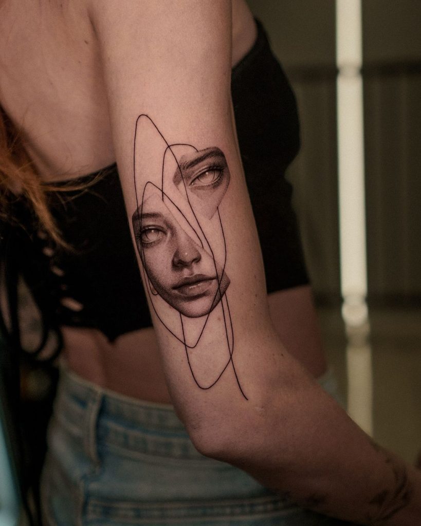 This tattoo shows a realistic portrait of a woman s face layered with an abstract, second face slightly offset, creating a surreal double-vision effect. Delicate linework outlines and overlaps with the facial features, giving it a dreamlike, distorted appearance. Located on the upper arm, this design explores themes of identity and perception in an artistic, thought-provoking style.