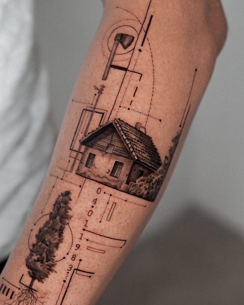 This unique tattoo combines a realistic illustration of a cozy cottage with technical, architectural-style linework, blending art and precision. Detailed with an axe, trees, and numbers, the design gives the appearance of a blueprint or diagram, as if mapping out a serene country setting. Located on the forearm, this tattoo feels like a tribute to nature, craftsmanship, or a cherished place.