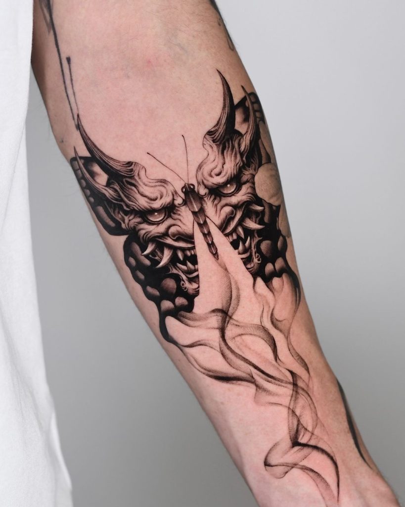 This tattoo features a unique butterfly with demon-like details, including fierce eyes and curled horns, giving it an intense, otherworldly look. Soft, smoky wisps extend downward from the butterfly s wings, adding a sense of movement. Located on the forearm, this design blends beauty with a dark, mystical edge, making the butterfly appear both graceful and intimidating.