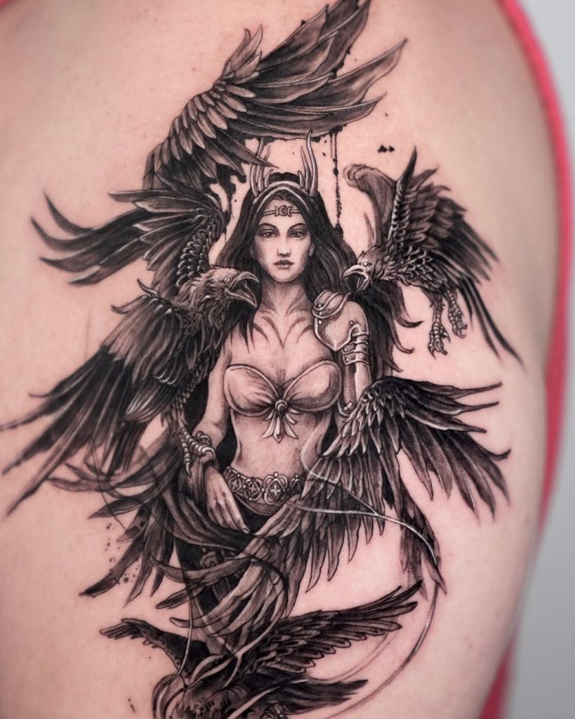 This detailed tattoo portrays a powerful goddess figure, adorned in armor and a crown with a crescent symbol, surrounded by several ravens in flight. The goddess s calm yet intense gaze, along with the dynamic wings of the ravens, create a sense of strength and mysticism. Positioned on the upper arm or shoulder, this design blends elements of mythology and nature, capturing the essence of a fierce and protective deity.