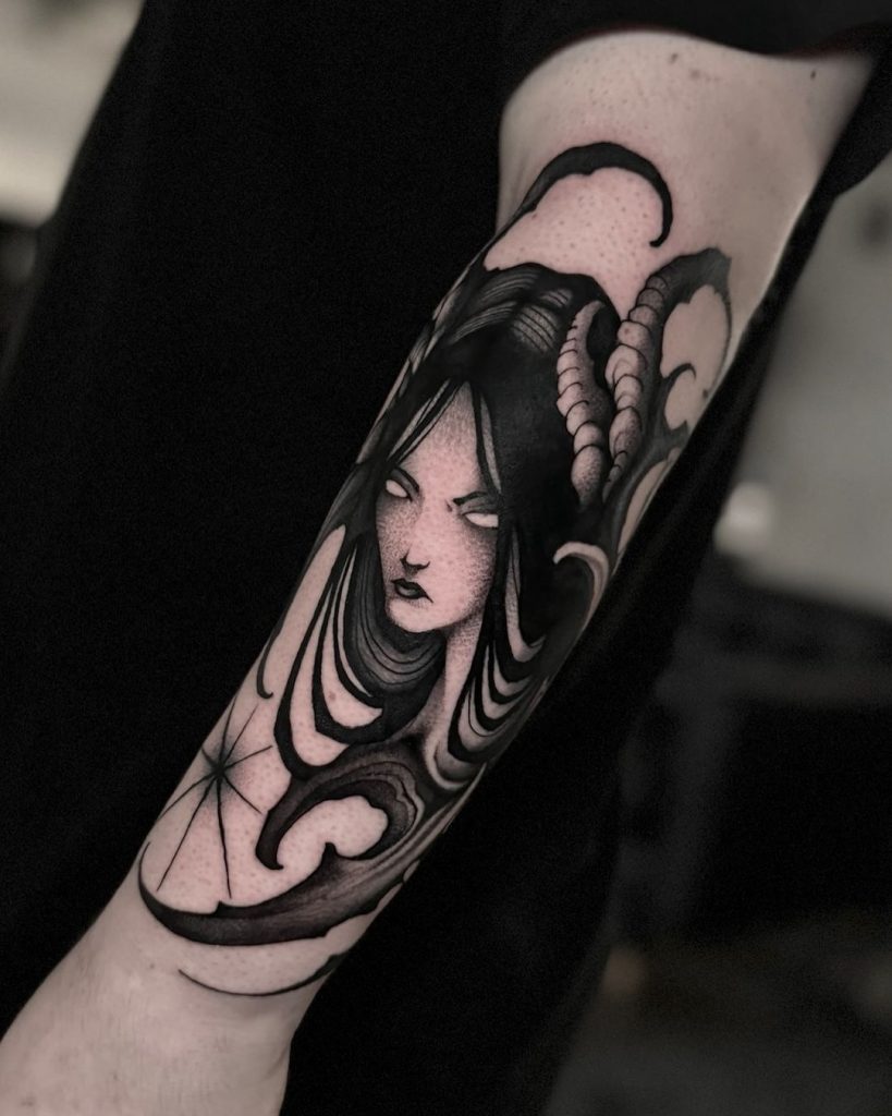 This forearm tattoo shows a hauntingly beautiful woman with empty eyes, surrounded by deep, swirling black shadows and wisps. With horns framing her head and sharp contrasts, she has a mysterious, otherworldly presence. The design adds an eerie, mystical vibe to the arm, capturing a sense of darkness and intrigue.