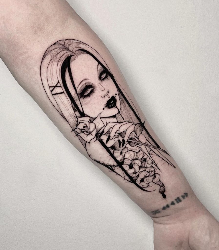 This tattoo shows a hauntingly beautiful woman with long, flowing hair and intense, dark makeup. She holds a rose with a tiny skull at its center, adding a gothic vibe to the design. Inked on the forearm, this piece is both eerie and elegant, blending mystery with dark floral beauty.