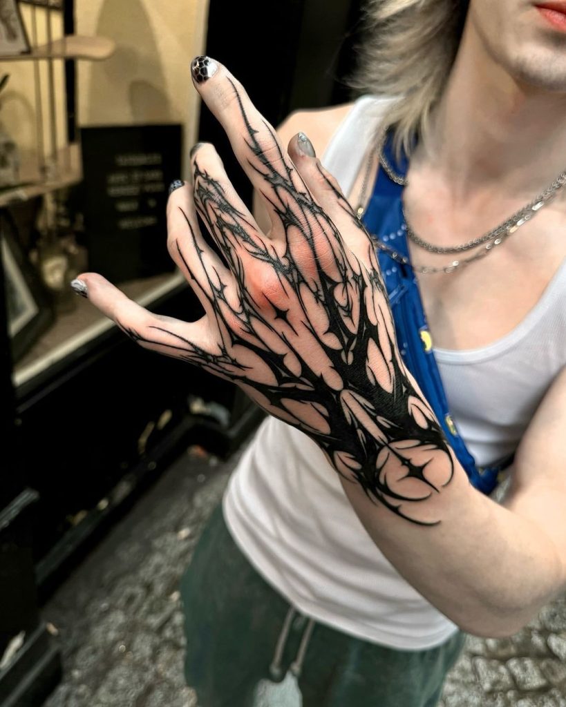 This hand tattoo features dark, branching patterns that flow from the fingers up toward the wrist, resembling twisted veins or creeping roots. Paired with long, glossy black nails, the design gives an eerie, gothic look. Covering the fingers and extending onto the back of the hand, this tattoo adds a striking, edgy vibe with a hint of the supernatural.