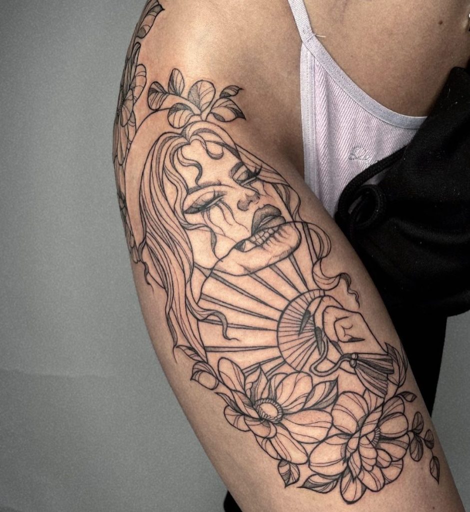 This detailed leg tattoo shows the face of a mysterious woman with flowing hair, her expression calm yet intense. She holds a fan in one hand, surrounded by large blooming flowers that add softness to the design. Located on the upper leg, this piece blends elements of nature with a sense of mystique, creating a striking and symbolic artwork.