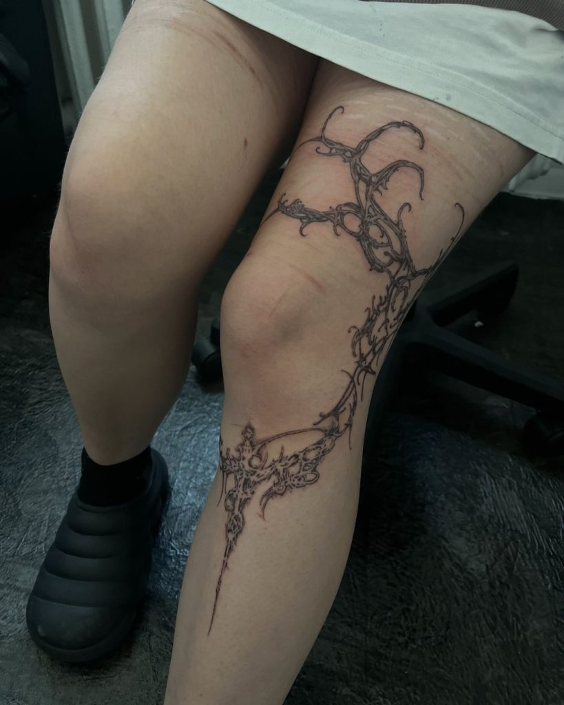 This Cybersigil tattoo features intricate, gothic-inspired linework that runs from the thigh, over the knee, and down the lower leg. The delicate, branching lines and decorative shapes give it an antique, almost filigree appearance. Placed along the leg, this design has a skeletal, organic feel, adding a mysterious elegance that enhances the natural contours of the body.