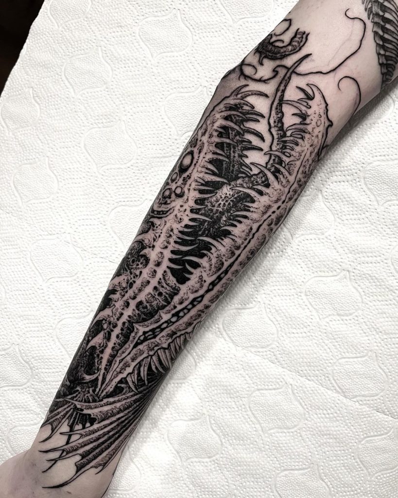 This tattoo stretches along the forearm, showcasing a highly detailed, alien-like exoskeleton with intricate textures, spikes, and organic patterns. The dark shading and fine linework create a lifelike, three-dimensional effect, giving the design a raw, otherworldly feel. With its biomechanical style, this piece evokes the image of a creature s spine or armor, blending sci-fi and horror elements into a captivating forearm tattoo.