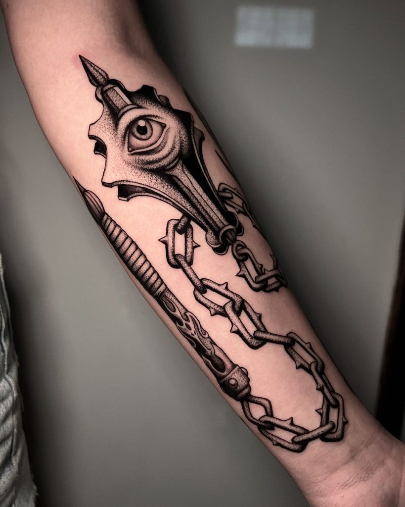 This unique tattoo features a stylized weapon with an all-seeing eye embedded in its ornate design, connected to a rugged, barbed chain that wraps around the forearm. The fine shading and bold outlines create a three-dimensional effect, giving the piece a sense of depth and texture. Positioned on the forearm, this design combines elements of fantasy and mysticism, evoking an aura of power and mystery.