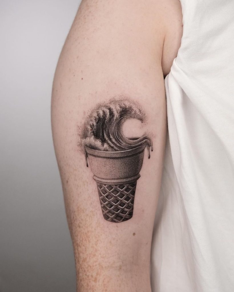 This clever tattoo combines a classic ice cream cone with a powerful ocean wave spilling over the top. Inked on the upper arm, it blends the refreshing feel of the ocean with the fun of a summertime treat. The design captures the imagination, making it both playful and artistic.
