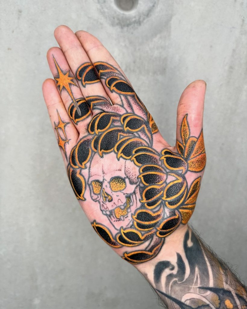 This eye-catching tattoo covers the palm with a bold design featuring a central skull surrounded by black petal-like shapes outlined in bright orange. The orange accents bring warmth and energy, contrasting against the darker elements. Small stars and dot shading add extra texture and depth, creating a striking piece that combines both vibrant color and gothic symbolism on the hand.