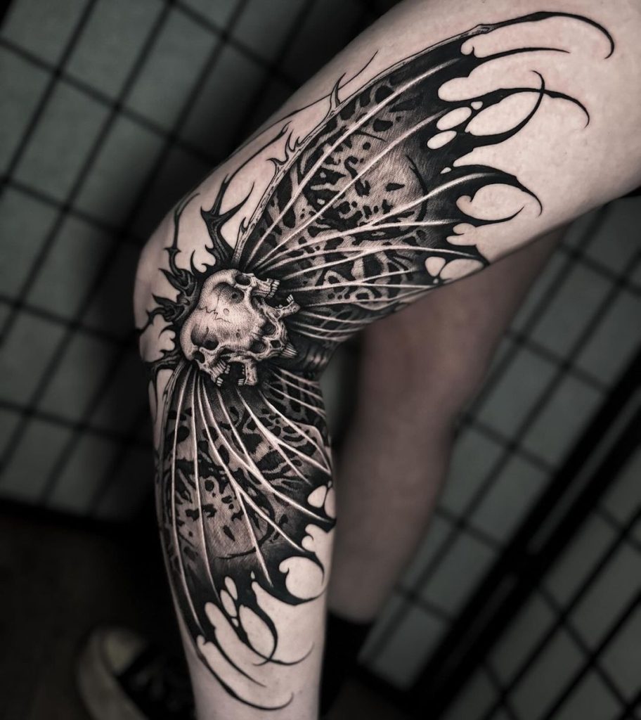 This bold tattoo displays a moth with detailed, tattered wings that spread across the thigh, but instead of a traditional body, it has a skull at its center. The intricate patterns on the wings and the jagged edges give it a dark, eerie elegance. Positioned on the thigh, this tattoo combines the symbolism of transformation and mortality in a striking, gothic style.