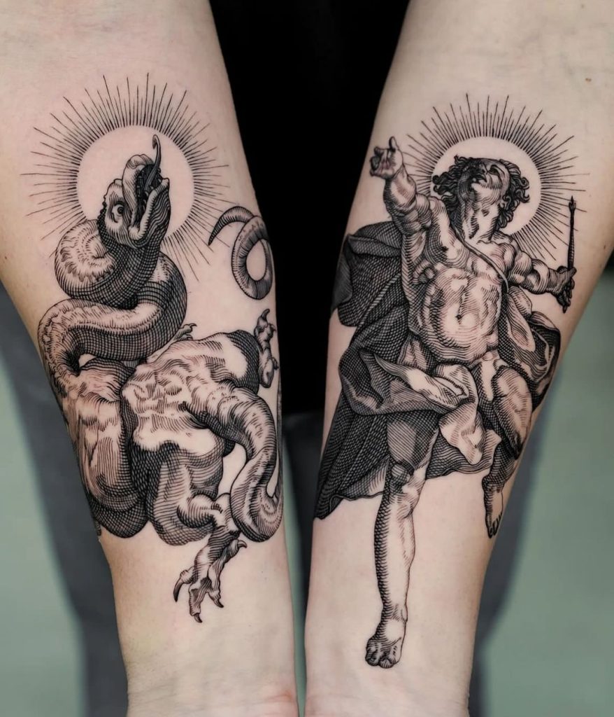 This intricate tattoo set depicts a dramatic scene of a saintly figure and a serpent, each on a separate forearm. The saint, adorned with a radiant halo, holds a spear with a powerful stance, while the serpent coils menacingly, crowned by its own halo of light. The fine linework and classic shading give this design a vintage, engravings-inspired look, capturing a symbolic struggle between good and evil across both forearms.