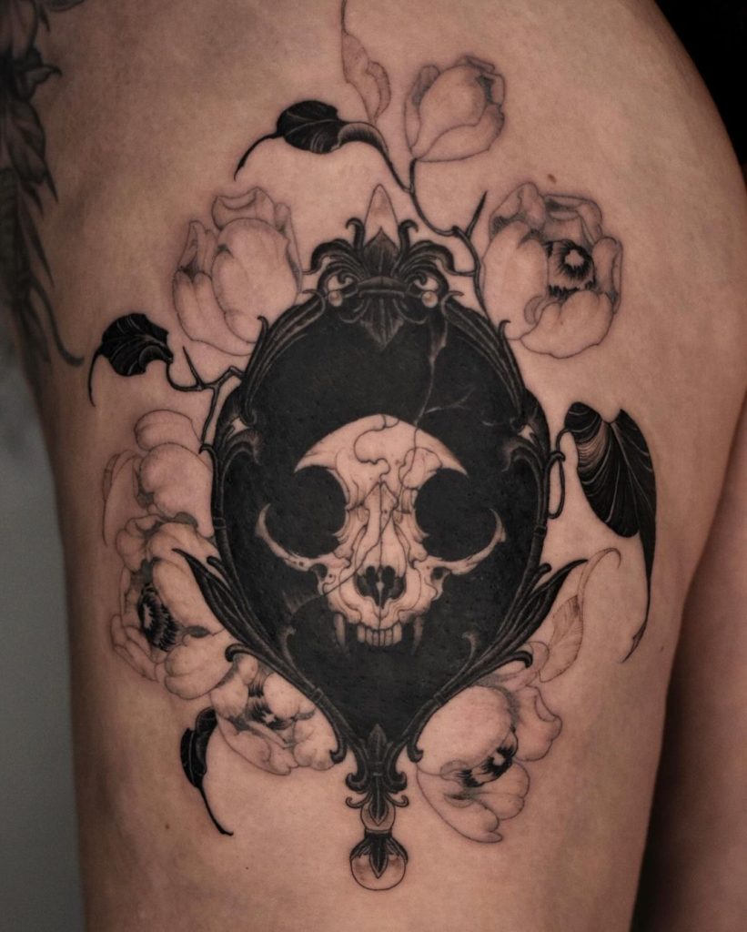 This tattoo features an intricate mirror-like frame filled with a dark, ominous skull, surrounded by soft, delicate flowers. The contrast between the bold black background and the light shading on the flowers creates a haunting yet beautiful effect. Positioned on the thigh, this design blends elements of gothic elegance with nature, capturing a balance between life and death.