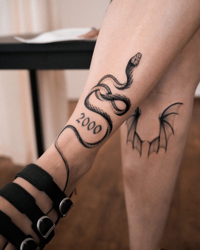 This sleek tattoo features a coiled snake slithering around the number “2000,” symbolizing the wearer s birth year. The snake s simple, elegant design wraps gracefully along the ankle, while a pair of black bat wings can be seen on the calf above, adding a subtle, gothic touch. This tattoo combines personal significance with a dark, minimalist aesthetic.