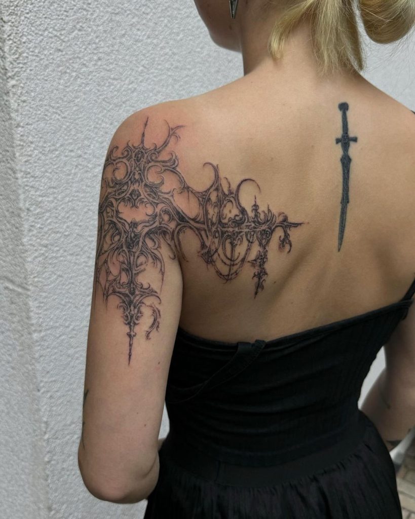 This tattoo features intricate, gothic-inspired ornamental cybersigil designs that stretch across the shoulder and upper back. The delicate, lace-like patterns have a vintage, wrought-iron look, adding an elegant yet dark aesthetic. Positioned on the shoulder and blending into the back, this design gives a regal, mystical vibe with its detailed linework and flowing structure.