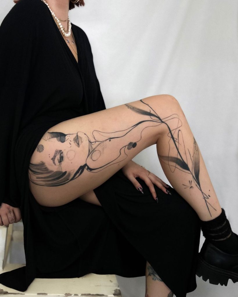 This tattoo combines a soft, abstract portrait of a woman’s face on the upper thigh with flowing lines and minimalist shapes extending down the leg. The design includes delicate dots and organic strokes, giving it a modern, artistic feel that plays with open space. Stretching from the thigh to the lower leg, this tattoo is both elegant and expressive, creating a unique body art piece.