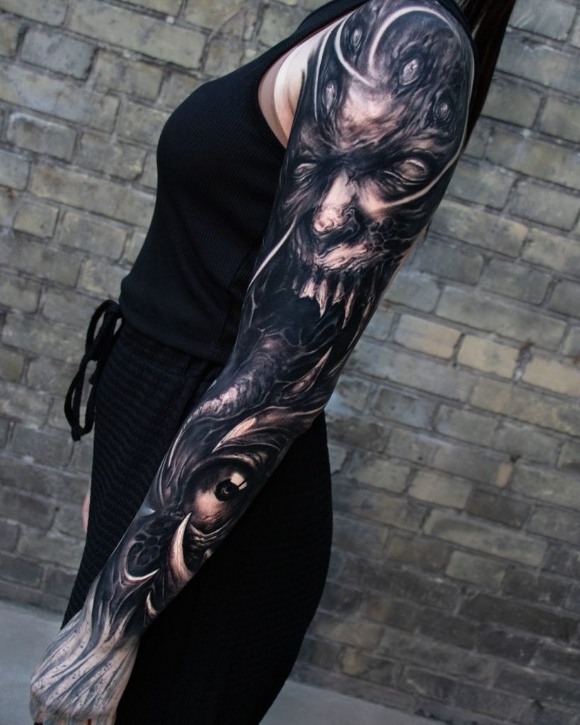 27. Dark Demon Sleeve Tattoo with Intense Realism
