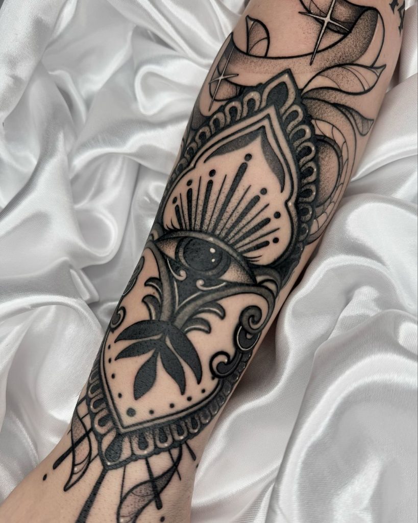 This forearm tattoo features a striking eye design, framed by intricate ornamental shapes and patterns. The dark shading and dotted accents create a mystical look, making the eye appear as if it s watching over everything. Surrounded by elegant swirls and leaf-like details, this tattoo has a protective, almost spiritual feel.