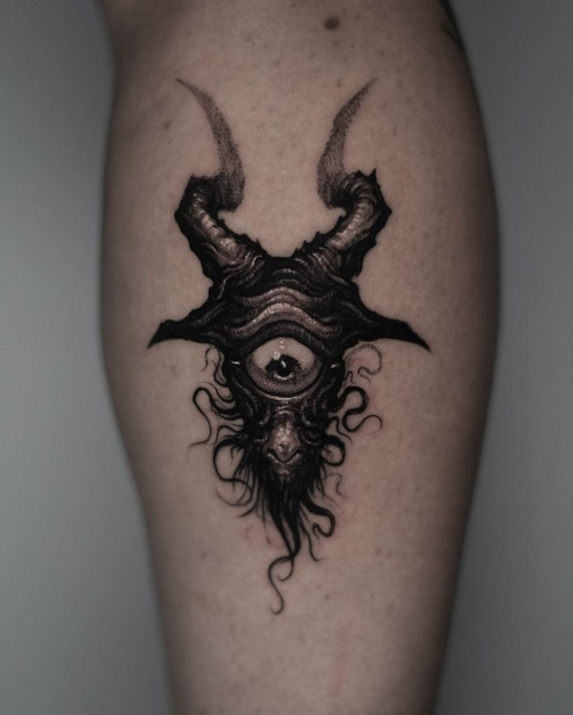 This tattoo depicts a mysterious creature with large, twisted horns and a single eye staring outward, giving it an eerie, all-seeing presence. The flowing, textured lines around the face and the wispy tendrils add a dark, supernatural vibe to the design. Positioned on the arm, this piece captures a unique blend of gothic and surreal elements, making it both haunting and captivating.